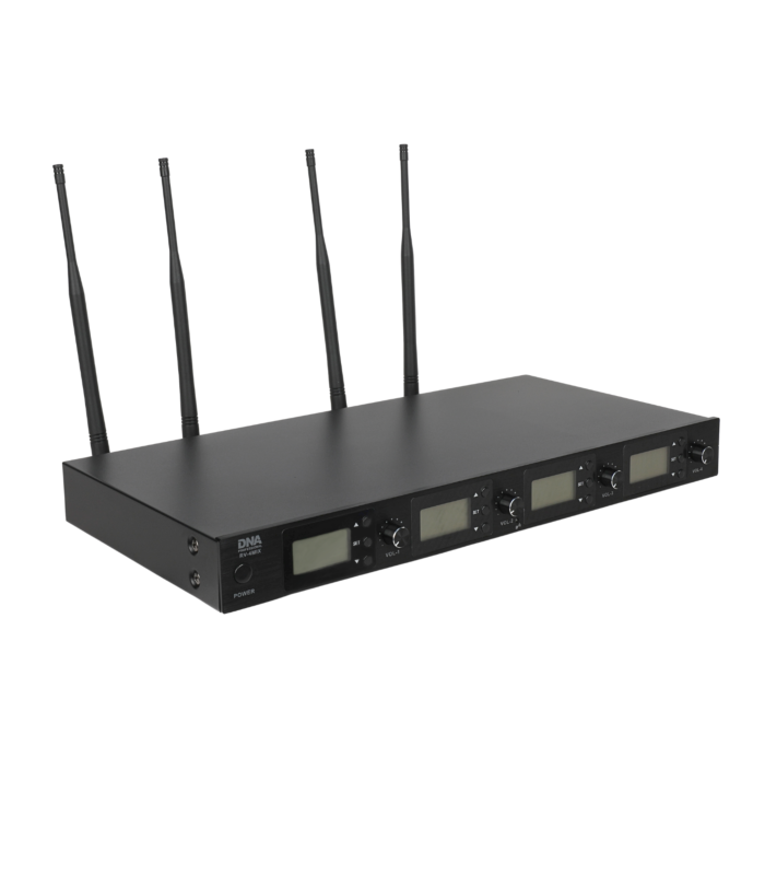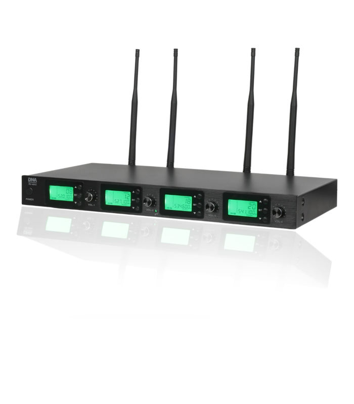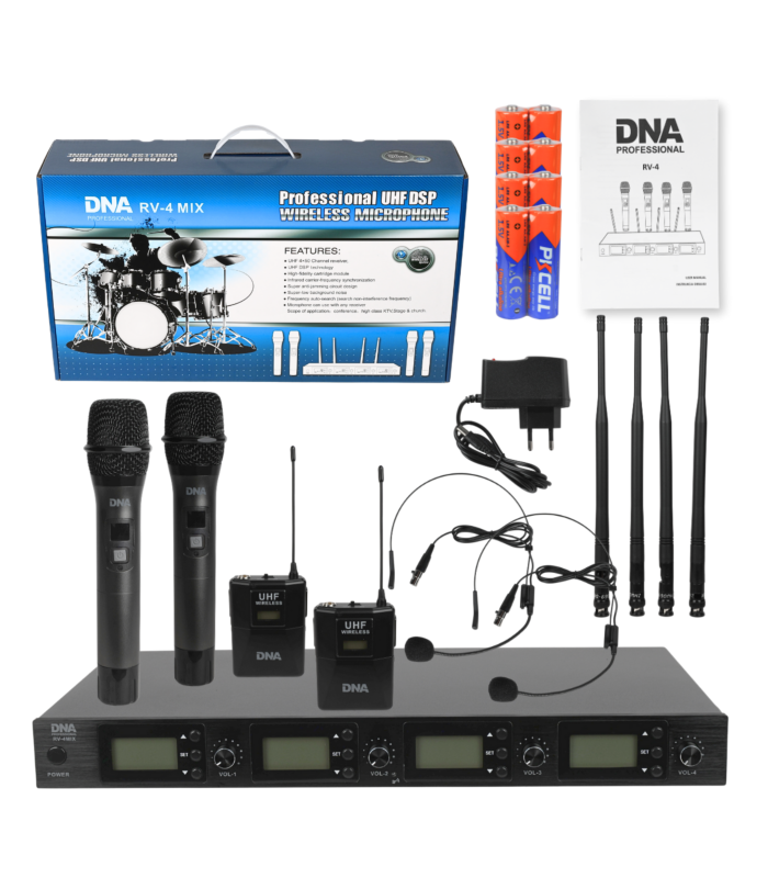 DNA RV-4 MIX to profesjonalny, bezprzewodowy zestaw mikrofonowy, w którego skład wchodzą dwa mikrofony doręczne, dwa nadajniki przypaskowe (bodypack) wyposażone w mikrofon zakładany na głowę, oraz odbiornik fal radiowych przesyłający sygnały audio do nagłośnienia. Komplet stanowi doskonałe rozwiązanie dla zespołów, grup wokalnych oraz firm eventowych. Świetnie sprawdza się na weselach podczas wspólnych biesiad, w karaoke, na scenie w czasie koncertów i różnego typu występów, a także podczas konferencji, spotkań autorskich i różnego typu wydarzeń kulturalnych.