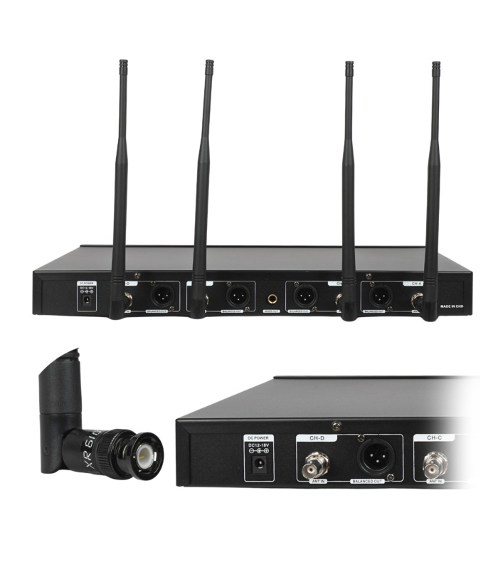 Odbiornik fal UHF posiada 2 kanały wyjściowe XLR (A i B) oraz wyjście jack 1/4. Z przodu znajdują się 4 oddzielne panele sterowania obsługujące poszczególne mikrofony. Za ich pomocą możemy sparować ze sobą urządzenia, wysyłając podczerwienią odpowiedną częstotliwość nadajnika do konkretnego panelu. Mikrofony są gotowe do pracy, a za pośrednictwem odbiornika możemy kontrolować ich głośność i funkcje kanałów. Szeroki zakres częstotliwości i duża prędkość przesyłania danych umożliwiają pracę mikrofonów bez zakłóceń.