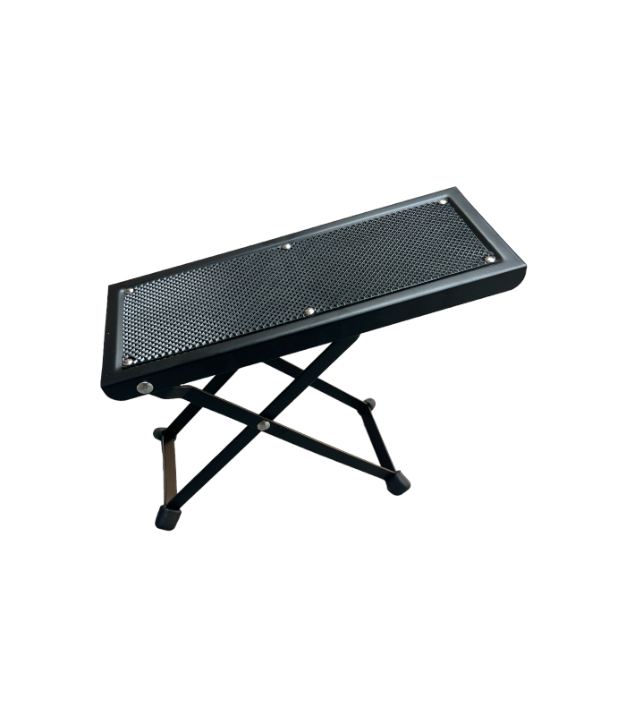 Niezbędnik każdego gitarzysty - dobrej jakości jakości podnóżek gitarowy w kolorze czarnym. Wykonany z trwałych i solidnych materiałów, które gwarantują długotrwałe użytkowanie. Gumowe nóżki zapewniają stabilność. Niewielkie rozmiary sprawiają, że w trakcie transportu jest bardzo praktyczny. Po złożeniu można przechowywać go w futerale/ pokrowcu do gitary. Regulowany, dzięki temu może dopasować wysokość do indywidualnych preferencji. Używany przez zespoły muzyczne, studia nagraniowe, wykonawców scenicznych, szkoły i inne.