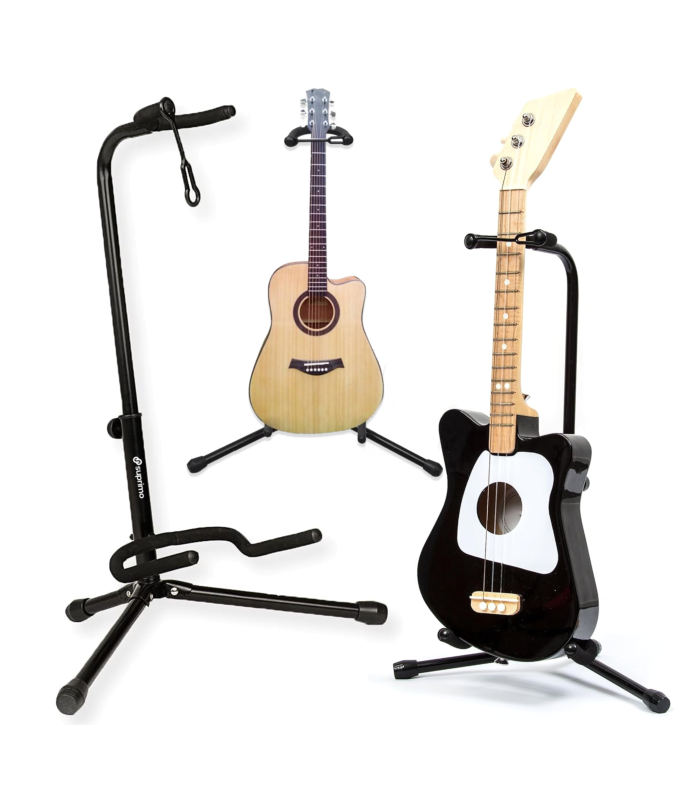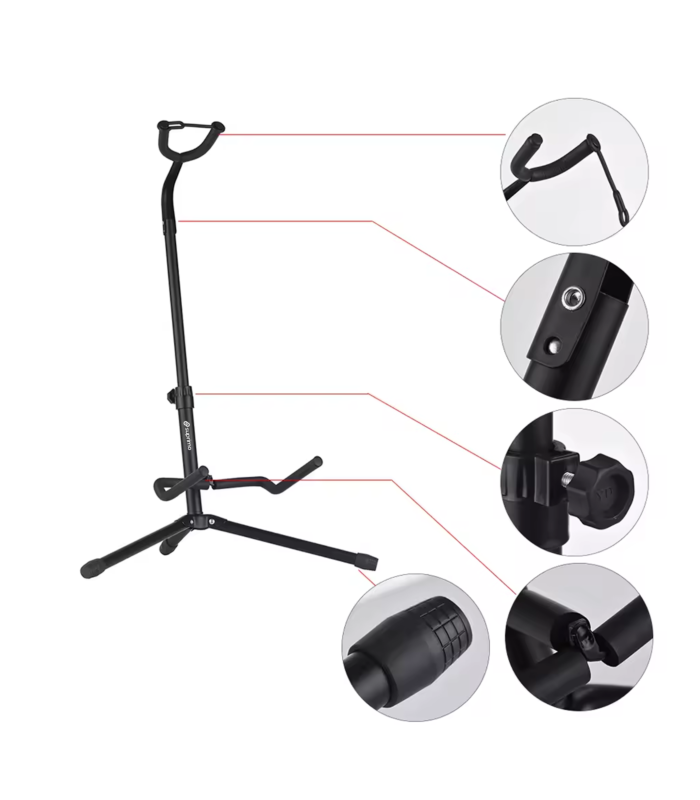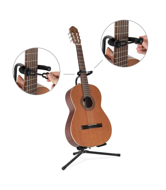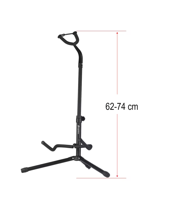 Dzięki regulowanej wysokości od 62 do 74 cm, statyw dopasujesz do różnych typów gitar – od klasycznych po basowe . Antypoślizgowe nóżki i stabilne nogi o rozstawie 51 cm gwarantują, że statyw pozostanie na miejscu .Gąbka techniczna uchwytu górnego i podpór chroni instrument przed zarysowaniem i innymi uszkodzeniami. Dodatkowo możliwość szybkiego złożenia to wygoda transportu i przechowywania .